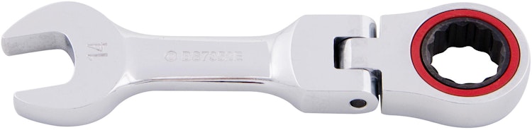Ringmaul mit Ratsche auf der Ringseite, extra kurzer gerader Schaft. Feinverzahnt mit 72 Zähnen, mit Gelenk, das bis zu 90° abgewinkelt werden kann, 12-kant, metrisch, innovatives Keilprofil, hochglanz verchromt, Chrom Vanadium.