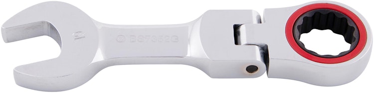 Ringmaul mit Ratsche auf der Ringseite. Kurz und gerade für zeitsparendes Arbeiten ohne Umsetzen, feinverzahnt mit 72 Zähnen. Gelenk zum Abwinkeln bis 90°, innovatives Keilprofil, hochglanz verchromt, Chrom Vanadium.