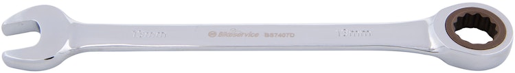 Der lange Bikeservice Ratschenschlüssel mit Ringmaul ermöglicht zeitsparendes Arbeiten ohne Umsetzen durch seine Ringratsche. Feinverzahnt mit 72 Zähnen, 12-kant, metrisch, aus hochglanzverchromtem Chrom Vanadium.