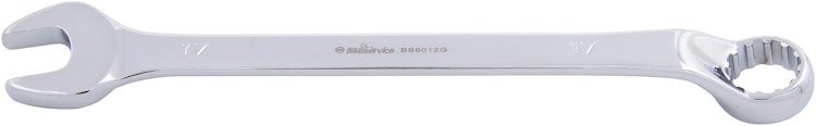 Der 17mm Ringmaulschlüssel mit langem Schaft und 70° gekröpfter Ringseite. 12-kant metrisch, hergestellt aus hochglanzverchromtem Chrom Vanadium mit innovativem Keilprofil.