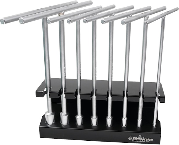 Der 8-teilige Schraubendrehersatz von Bikeservice verfügt über starre T-Griffe mit Außensechskant. Die Werkzeuge sind durchgehend gehärtet und hochglanzverchromt. Inklusive Größen: SW 6, 8, 10, 12, 13, 14, 17, 19 mm.