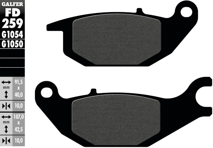Hochwertiger GALFER Bremsbelagsatz FD259 in der organischen Standardmischung G1054. Gefertigt aus Stahl für maximale Sicherheit und Bremsleistung, die ECE-R-90-Normen übertrifft.