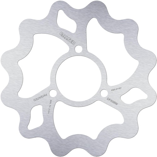 Zertifizierte GALFER DF698 Wave-Bremsscheibe. Starre Stahlkonstruktion mit R90R-Zulassung für maximale Sicherheit und konstante Bremsleistung im Alltag.