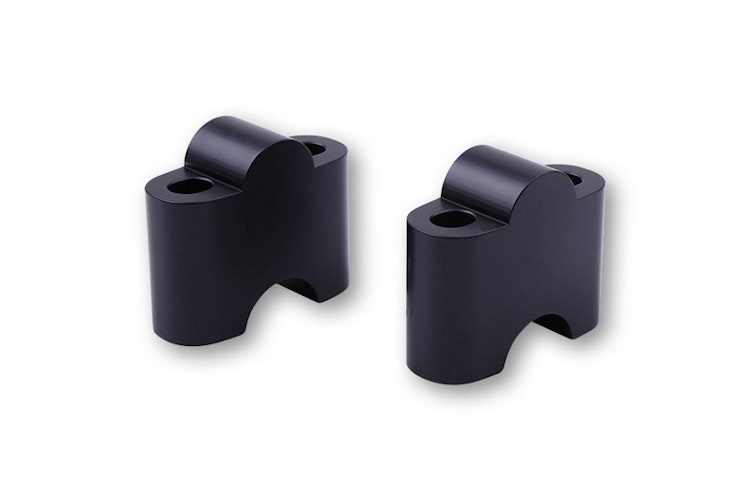 Schwarze Aluminium-Lenker-Distanzböcke zur Erhöhung um 35 mm. Geeignet für Lenker mit 22,2 mm Durchmesser. CNC-gefräste Komponenten zum Einbau in die Serienklemmung inklusive ABE.