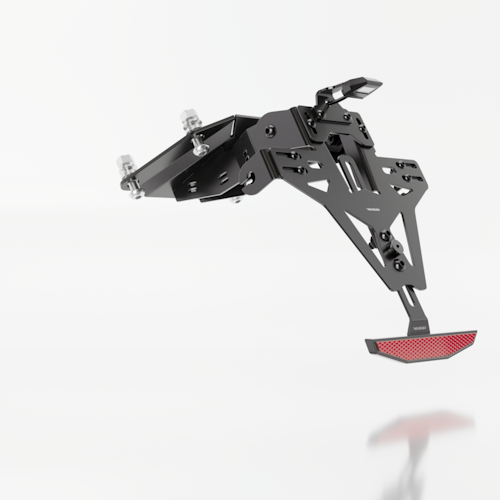 Dieser modellspezifische HIGHSIDER pro AKRON-RS PRO für Kawasaki Modelle ersetzt den originalen Halter an den vorhandenen Befestigungspunkten. Eine zusätzliche Sicherungsschraube fixiert die Kennzeichenplatte stabil in der gewünschten Position. Die mitgelieferte LED-Kennzeichenleuchte ist aus Aluminium gefräst und lässt sich in der Höhe anpassen.