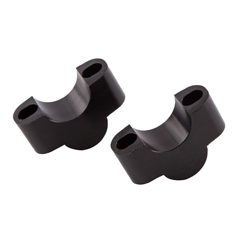 HIGHSIDER pro Lenkererhöhung in Schwarz. CNC-gefräste Distanzstücke für 25 mm Anhebung der Lenkerposition. Schwarz eloxiertes Aluminium für 28,6 mm X-Bar Lenker. Eintragungsfrei durch ABE für RM25.