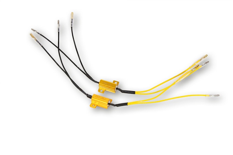 Leistungswiderstand-Set (10 Ohm) zur Behebung von Blinkfrequenz-Problemen bei der Verwendung von LED-Technik. Simuliert eine herkömmliche 21 Watt Glühlampe und ist für 12V Systeme ausgelegt. Die Widerstände werden paarweise mit fertig konfektionierten Kabeln geliefert.