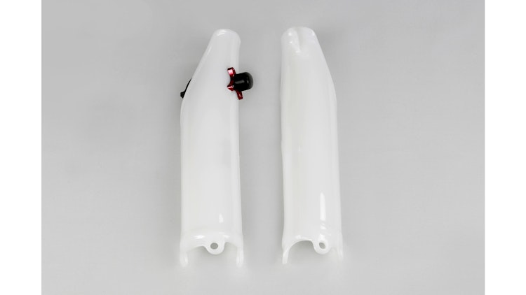 UFO Plast Gabelprotektor für Honda in Weiß. Robuster Schutz aus Polypropylen für Enduro und Motocross-Einsatz.