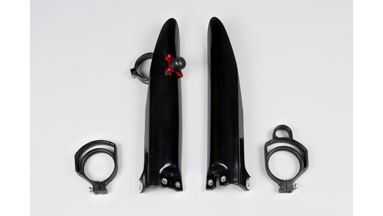 UFO Plast Gabelprotektor für Kawasaki-Modelle aus strapazierfähigem Polypropylen. Robuster Schutz in Schwarz für Enduro und Off-Road.