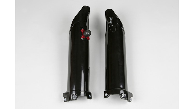 UFO Plast Gabelprotektor für Kawasaki in Schwarz. Robuster Schutz aus Polypropylen für Teleskopgabeln bei Enduro- und Motocross-Fahrten.