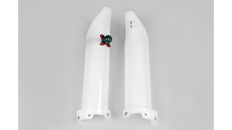 UFO Plast Gabelprotektor für Kawasaki in Weiß. Hochwertige PP-Kunststoff-Schutzvorrichtung für sichere Gelände- und Enduro-Fahrten.