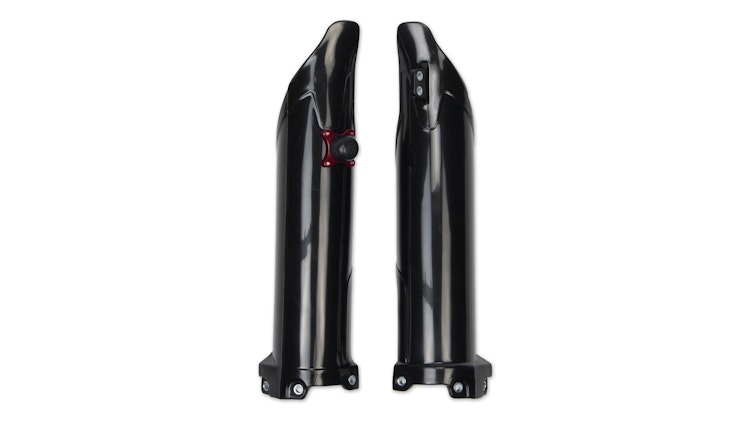UFO Plast Gabelprotektor für Kawasaki-Modelle in Schwarz. Aus robustem Polypropylen für Enduro und Motocross. Hochwertiger Schutz für die Gabelanlage.