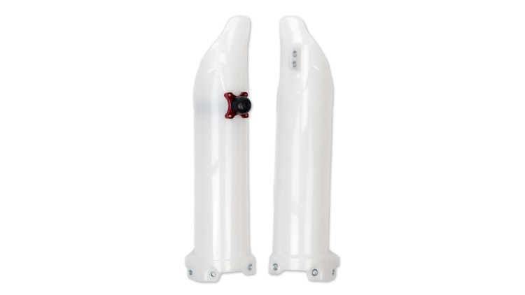 UFO Plast Gabelprotektor für Kawasaki in Weiß. Hochwertiger Kunststoff-Schutz für optimale Gabelschonung bei Enduro und Motocross.