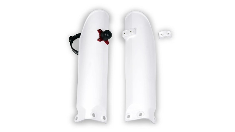 UFO Plast Gabelprotektor weiß für KTM-Modelle aus strapazierfähigem Polypropylen mit optimalen Schutz für Enduro und Motocross.
