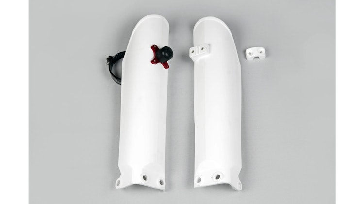 UFO Plast Gabelprotektor weiß für KTM. Robuster Kunststoffschutz aus Polypropylen für sicheren Gabelschutz beim Enduro und Motocross.