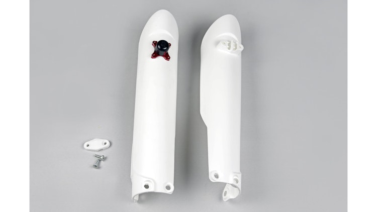 UFO Plast Gabelprotektor in Weiß für KTM-Modelle. Robuster Kunststoffschutz für Gabelschäfte mit einfacher Montage und langlebiger Qualität.