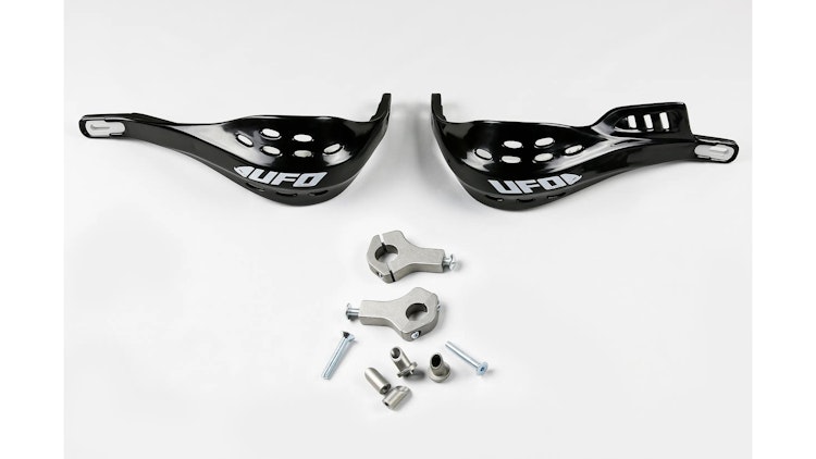UFO Plast Handprotektor Jumpy in Schwarz mit Aluminium-Einsätzen. Universell einsetzbar für Enduro und Motocross mit hochwertigem Kunststoff und Montageteilen.