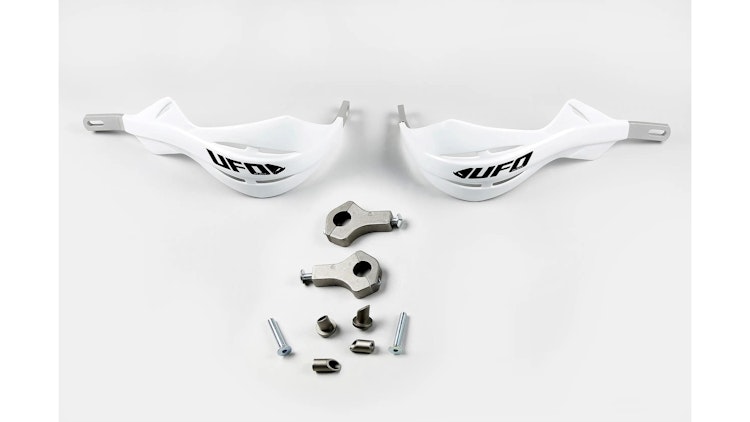 Universeller UFO Plast Handprotektor Alu in Weiß mit schlagfestem Kunststoff und Aluminium-Verstärkung. Inkl. Montageteile für einfache Installation.