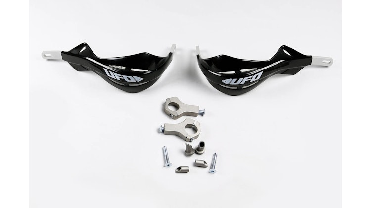 UFO Plast Handprotektor Alu in Schwarz mit Kunststoff-Aluminium-Konstruktion für Enduro und Motocross. Universell einsetzbar mit Montagezubehör.