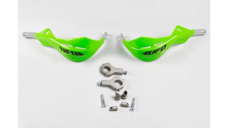 UFO Plast Handprotektor Alu in Grün - Universal-Handschutz mit schlagfestem Kunststoff und Aluminium-Verstärkung für Enduro und Motocross. Inklusive Montageteile.