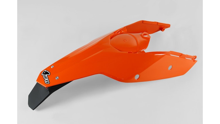 UFO Plast Kotflügel hinten für KTM mit LED-Rücklicht und Bremslicht. Orange, robustes Polypropylen, sichere Befestigung.