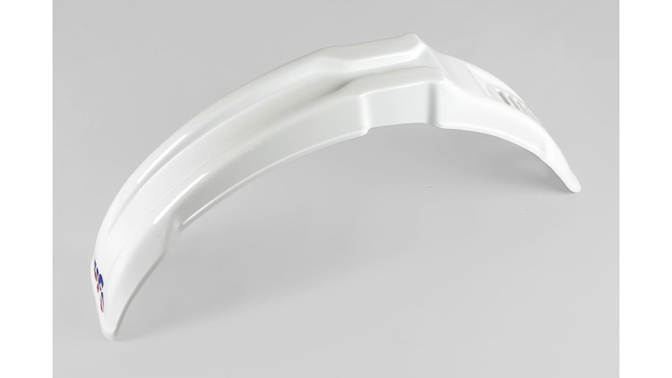 UFO Plast Kotflügel Vintage Front in Weiß aus robustem Kunststoff. Hochwertige Frontverkleidung für klassische Motorräder mit langlebigem Polypropylen-Material.