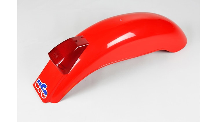 UFO Plast Vintage Heck-Kotflügel mit integrierter LED-Rücklicht und Bremslicht in rot. Robustes Polypropylen-Material für optimale Schutzfunktion und Haltbarkeit.