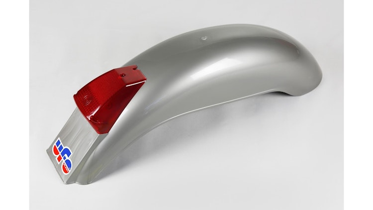 UFO Plast Hinter-Kotflügel Vintage mit LED-Rücklicht und Bremslicht in Silber – strapazierfähiges PP-Material für Enduro und Off-Road.