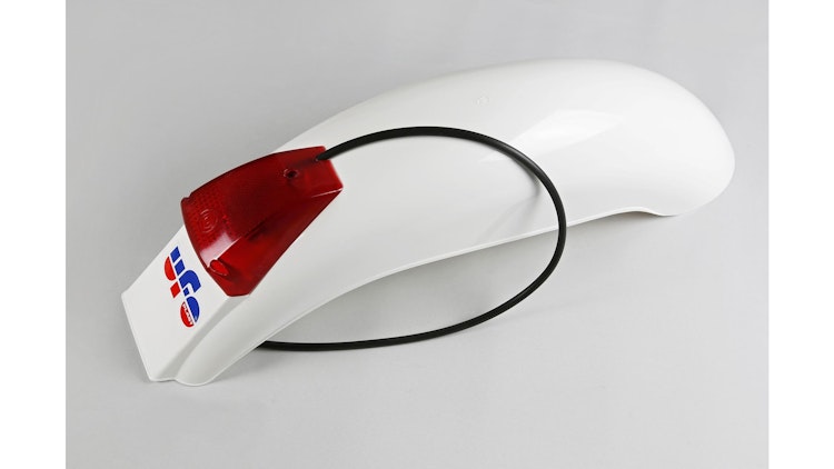 UFO Plast Vintage Hinter-Kotflügel weiß mit LED-Rücklicht und Bremslicht. Robustes PP-Material für Enduro und Off-Road.