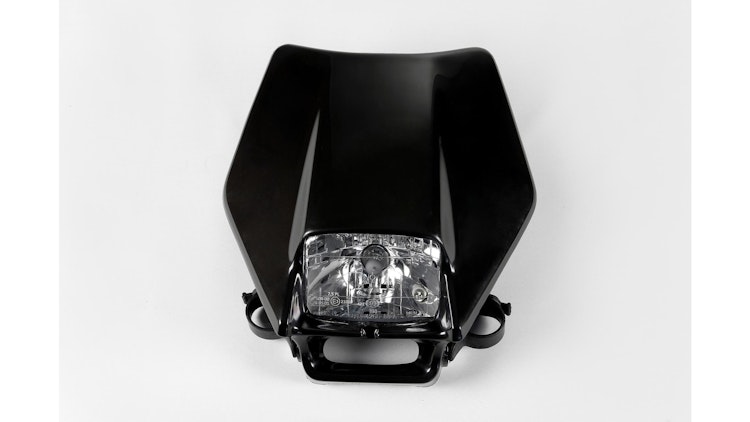 UFO Plast Halogen-Scheinwerfer Ghilbli, 12V 60/55W, schwarze Lichtmaske aus robustem Kunststoff für Enduro und Motocross.