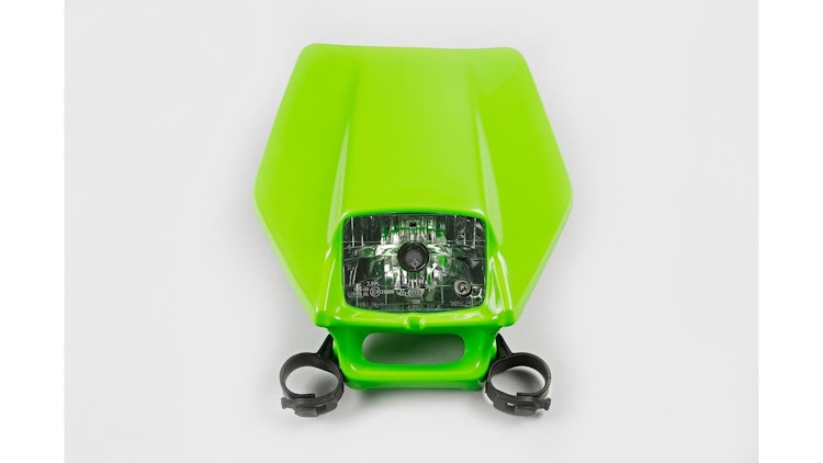 UFO Plast Halogen-Scheinwerfer Ghilbli mit grüner Lichtmaske, 12V 60/55W. Robuster Kunststoff für Enduro und Motocross.
