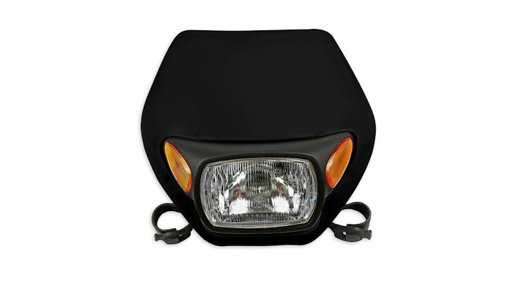 UFO Plast Oregon Scheinwerfer mit integriertem Blinker. 12V, 35W Leistung. Robuste schwarze Kunststoffausführung für Enduro und Off-Road Motorräder.