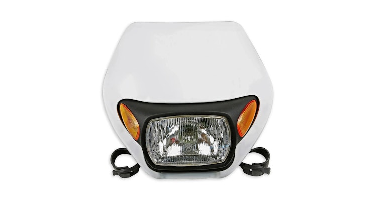 UFO Plast Scheinwerfer Oregon mit integrierten Blinkern, 12V 35W, weiß. Robuste Kunststoffausführung für sichere Enduro- und Off-Road Fahrten.
