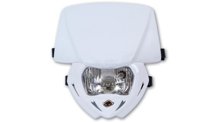 UFO Plast Scheinwerfer Panther – weiße Lichtmaske mit 12V/35W für Enduro und Off-Road. Robuster Kunststoff, vollständig montiert und einsatzbereit.