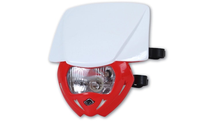 UFO Plast Panther Scheinwerfer, weiß/rot, 12V/35W. Robuste Lichtmaske aus Kunststoff für Enduro und Off-Road Motorräder.