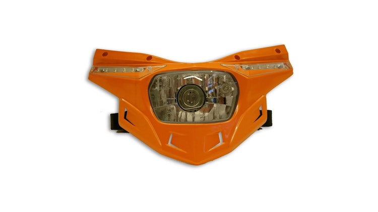 UFO Plast Stealth LED-Scheinwerfer mit Lichtmaske, unterer orange Teil aus strapazierfähigem Kunststoff für Enduro und Off-Road.
