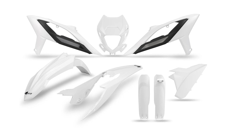 UFO Plast Verkleidungssatz für Beta-Modelle in Weiß mit Gabelprotektor aus strapazierfähigem Kunststoff für Enduro und Motocross.