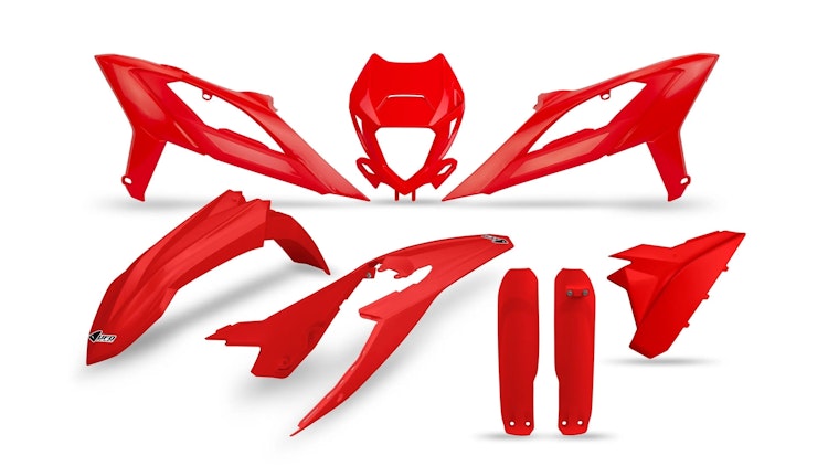 UFO Plast Verkleidungssatz für Beta in Rot mit Gabelprotektor, Kotflügel, Lichtmaske und Kühlerabdeckung aus robustem Polypropylen.