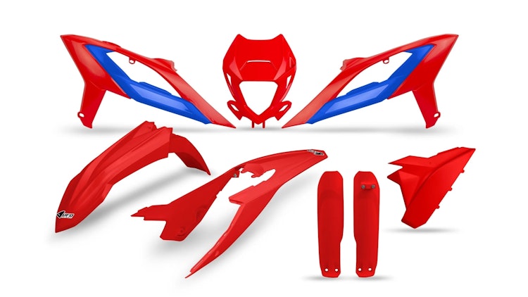 UFO Plast Verkleidungssatz für Beta-Modelle in rot/blau. Hochwertiges PP-Material mit Gabelprotektor, Kotflügeln, Kühlerabdeckung und Lichtmaske. Idealer Schutz für Enduro und Motocross.