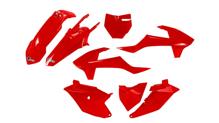 UFO Plast Verkleidungssatz für GasGas Motorräder in Rot. Robustes PP-Material, OEM-Qualität, komplettes Set für Enduro und Off-Road.
