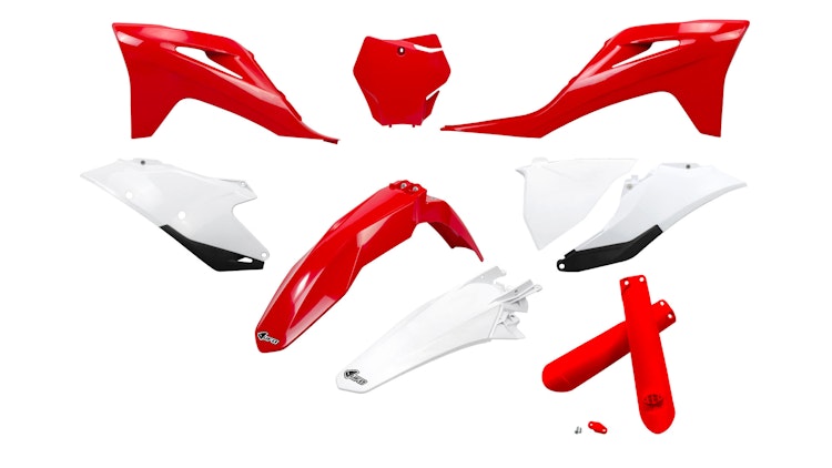 UFO Plast Verkleidungssatz für GasGas OEM in rot-weiß. Hochwertiges Polypropylen, strapazierfähig und langlebig. Perfekt für Enduro und Offroad.