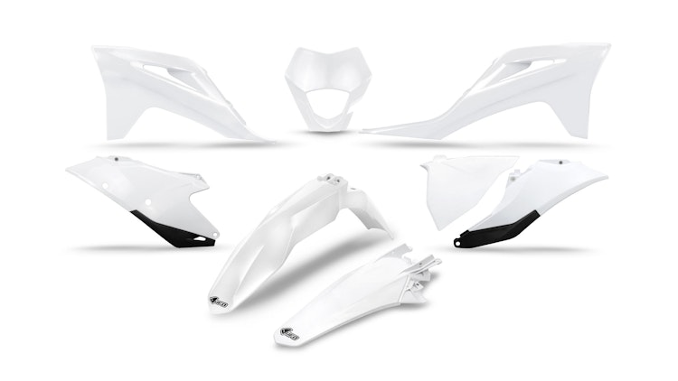 UFO Plast Verkleidungssatz für GasGas-Motorräder in weiß. Hochwertiges Polypropylen-Material, strapazierfähig und langlebig. Kompletter Schutz für Enduro und Motocross.