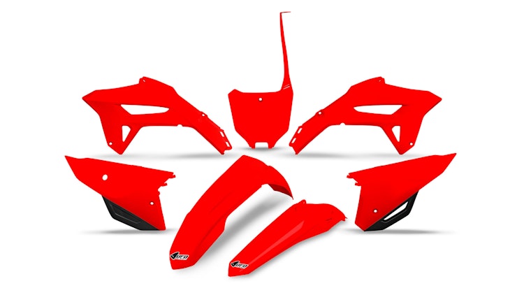 UFO Plast Verkleidungssatz für Honda in Rot/Schwarz. Hochwertiges Polypropylen-Material für Enduro, Motocross und Off-Road. OEM-Qualität mit strapazierfähigem Design.
