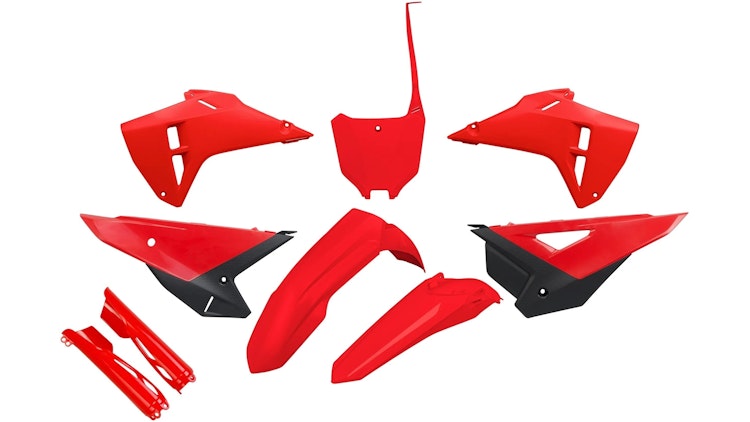 UFO Plast Verkleidungssatz für Honda-Modelle in rot-schwarz. Hochwertiges Polypropylen, robust und langlebig für Enduro und Motocross.