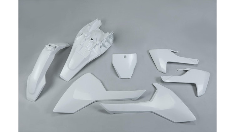 UFO Plast OEM Verkleidungssatz für Husqvarna in Weiß. Hochwertiges Polypropylen, strapazierfähig und langlebig für Enduro und Motocross.