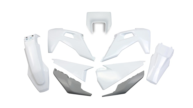 UFO Plast Verkleidungssatz für Husqvarna in Weiß/Grau. Hochwertiges Polypropylen, OEM-Qualität, perfekte Passform und langlebiger Schutz für Enduro und Off-Road.