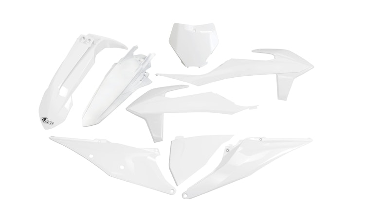 UFO Plast Verkleidungssatz für KTM-Modelle aus hochwertigem PP-Kunststoff in Weiß – robustes Zubehör für Enduro und Motocross.