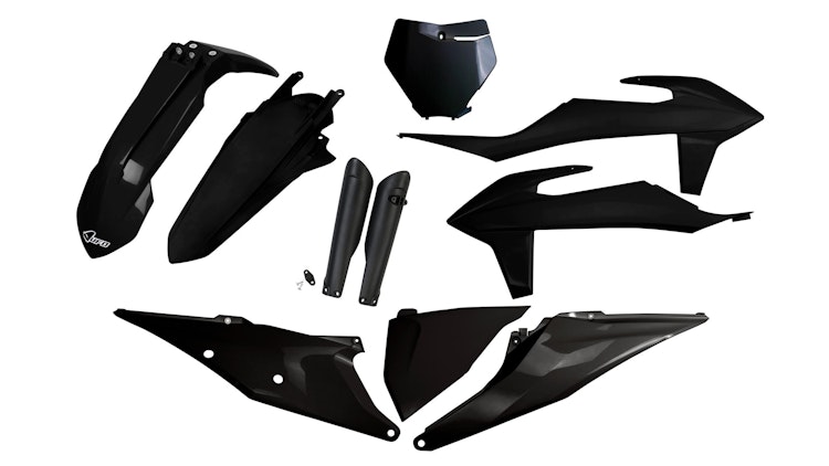 UFO Plast Verkleidungssatz für KTM in Schwarz – hochwertiges Polypropylen, langlebig und robust für Enduro-, Motocross- und Off-Road-Einsätze.