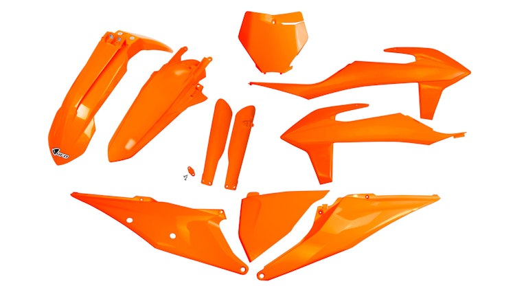 UFO Plast Verkleidungssatz für KTM-Modelle aus langlebigem Polypropylen in Orange. Strapazierfähig und UV-beständig für Enduro und Motocross.