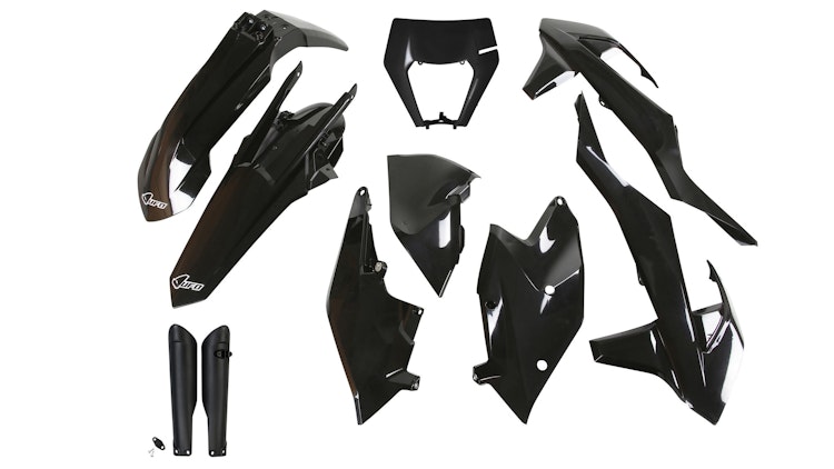 UFO Plast Verkleidungssatz für KTM-Modelle aus robustem Kunststoff. Schwarze Ausführung mit strapazierfähigem Polypropylen für optimalen Schutz.